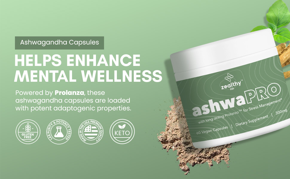 Get zealous about sustaining your peak performance with Zealthy Life’s ashwaPRO. Powered by Prolanza, these ashwagandha capsules are loaded with potent adaptogenic properties. Taking 1 capsule a day helps enhance mental wellness, making ashwaPRO your trustworthy ally in optimizing your wellbeing.