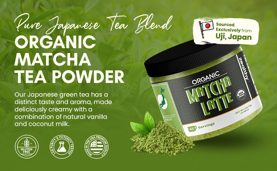 Zealthy Life - Organic Matcha Latte, Pure Japanese Tea Blend with Ashwagandha & Maca, Matcha Tea Powder with Natural Coconut Milk & Vanilla, No Added Sugar, 4.68 oz (45 Servings)