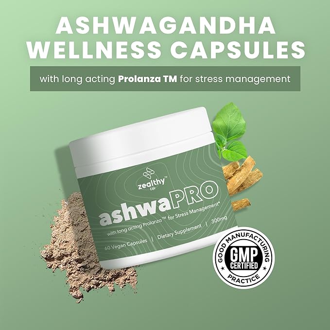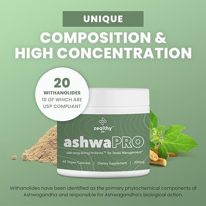 ashwaPRO, Ashwagandha Capsules with USP-Compliant Withanolides, Vegan Ashwagandha Supplements with Extensive Adaptogenic Support, Mental Wellness & Focus Supplement, 300 mg per Capsule - Zealthy Life
